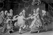 Country dancing probably arrived in the 16th century also, though we have no early documentation. We do have records that Charles Cheate taught dancing in Virginia by 1670, and then in Boston in 1676, and we begin to have mention of other dance teachers. By 1706, there were established dance academies in Boston and Philadelphia and a few other places. And not just colonists were learning to dance - a French dance instructor named Monsieur Violet taught country dance to the Iroquois Indians, who paid him with beaver skins and cured bear meat.
