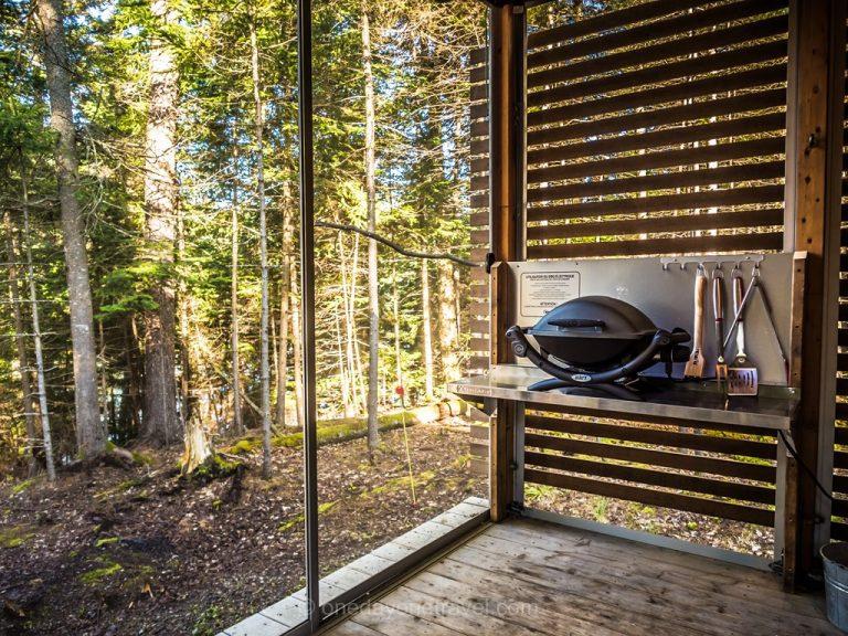 As is always the case in Canadian parks, there's a wooden table and a fireplace to build a fire outside. Unfortunately, it was the rain that took it away that evening. Instead, we're going to tell you about the interior, which begins at the entrance with a large veranda terrace overlooking the pine forest, complete with barbecue and sun loungers.